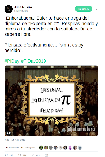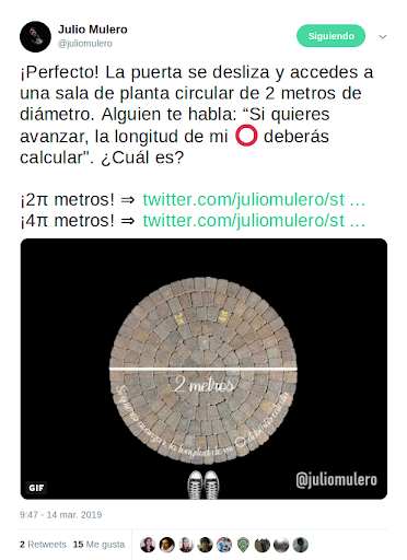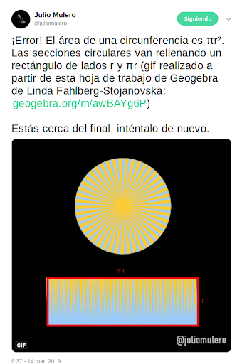 Hace unos días, Julio Mulero (@juliomulero, en Twitter), profesor de matemáticas de la Universidad de Alicante y miembro del grupo de divulgación matemáticas Dimates, lanzó un hilo en Twitter llamado «Sin π estoy perdido» que bien puede servir como ejemplo de Aprendizaje Basado en Problemas, utilizando un juego matemático como motivación para el alumnado. La experiencia fue aplaudida y difundida extensamente en la red por muchos agentes del ámbito de la educación.