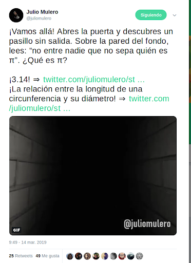 En este contexto y con esta motivación, el pasado 14 de marzo el profesor Julio Mulero planteó un juego desde su cuenta de Twitter @juliomulero. El planteamiento es sencillo. El reto comienza tras “atravesar” una misteriosa puerta sobre la que se puede leer la frase “Sin π estoy perdido” y que esconde un oscuro laberinto de pasillos y estancias. Una “voz” plantea al participante varias cuestiones relacionadas con el número π cuyas respuestas le permitirán (o no) alcanzar la superficie y obtener el diploma de Experto en π.