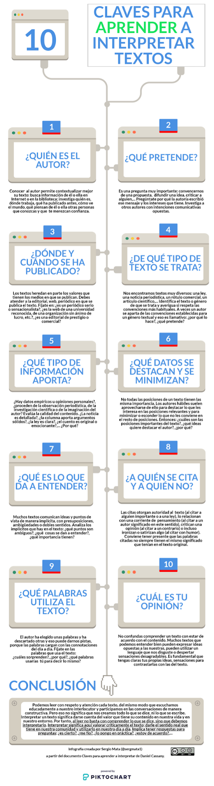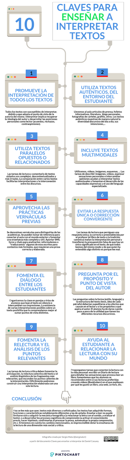 Antes de continuar con la narración de esta experiencia de aprendizaje, destacamos que adoptar una mirada crítica sobre una situación, un hecho o interpretar la lectura de un texto, requiere previamente enseñar a practicar esta estrategia para poder aplicarla en ciertas situaciones que puedan justificar que se han adquirido a través de la preocupación por la creación de argumentos claros y ordenados con sentido, que respeten la crítica de propios y ajenos ante una circunstancia dada. Por ello, no ha de darse por hecho el conocimiento de la interpretación. En este sentido, para la defensa de estas ideas u opiniones propias o ajenas nos han sido útiles el contenido de 10 claves para enseñar a interpretar y 10 claves para aprender a interpretar (Cassany), organizado en las siguientes infografías.