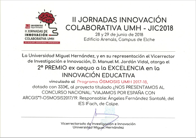 Además nuestro proyecto EDIA, presentado en las II JORNADAS DE INNOVACIÓN COLABORATIVA UMH, ha recibido el 2º Premio ex aequo a la EXCELENCIA en la INNOVACIÓN EDUCATIVA vinculado al Programa ÓSMOSIS.