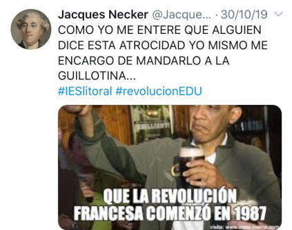 - Categoría Meme Humorístico en el que los alumnos, sin perder de vista el tema central del proyecto, podían combinar imágenes graciosas actuales con frases y referencias propias de la época de las revoluciones… Creatividad, ingenio, un poquito de mala leche en algunas ocasiones, o lo que venimos a llamar humor canalla. Y la Categoría Meme Frase Célebre en el que reproduciendo una frase de un personaje histórico relevante de la época podrían utilizar un fondo apropiado sea humorístico o no.
