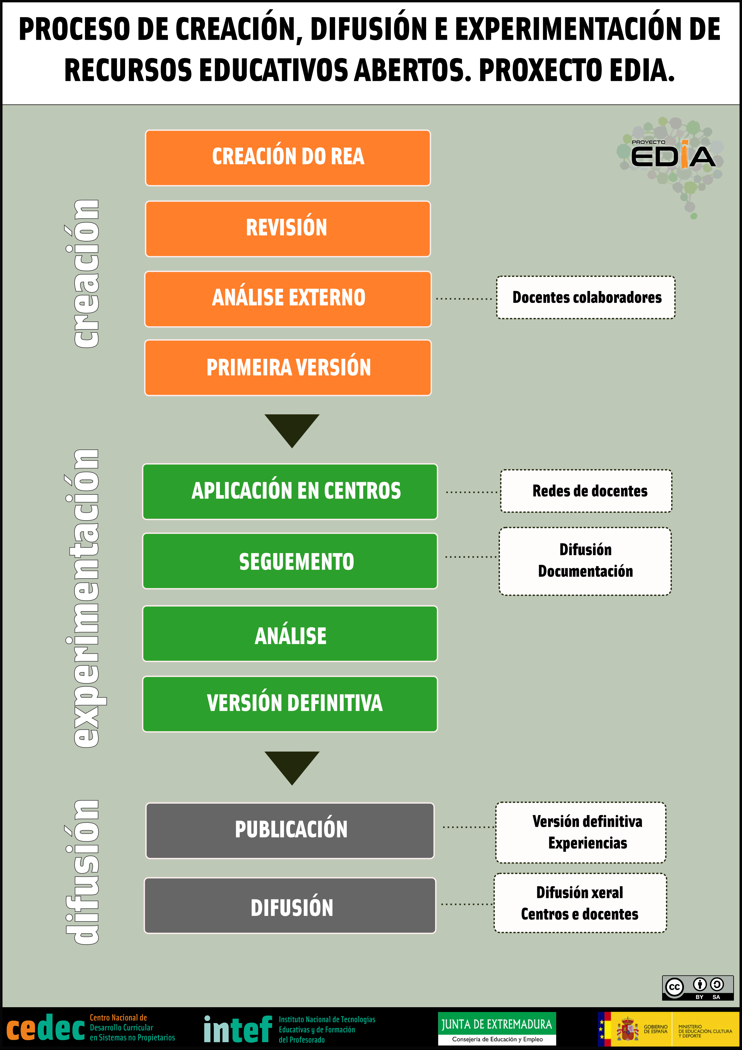 Crear, experimentar, revisar y difundir. Estos son los cuatro pasos clave que define el protocolo para la creación de recursos educativos abiertos de Proyecto EDIA. Esta propuesta es el resultado de las aportaciones de los docentes participantes en las II Jornadas del proyecto EDIA.