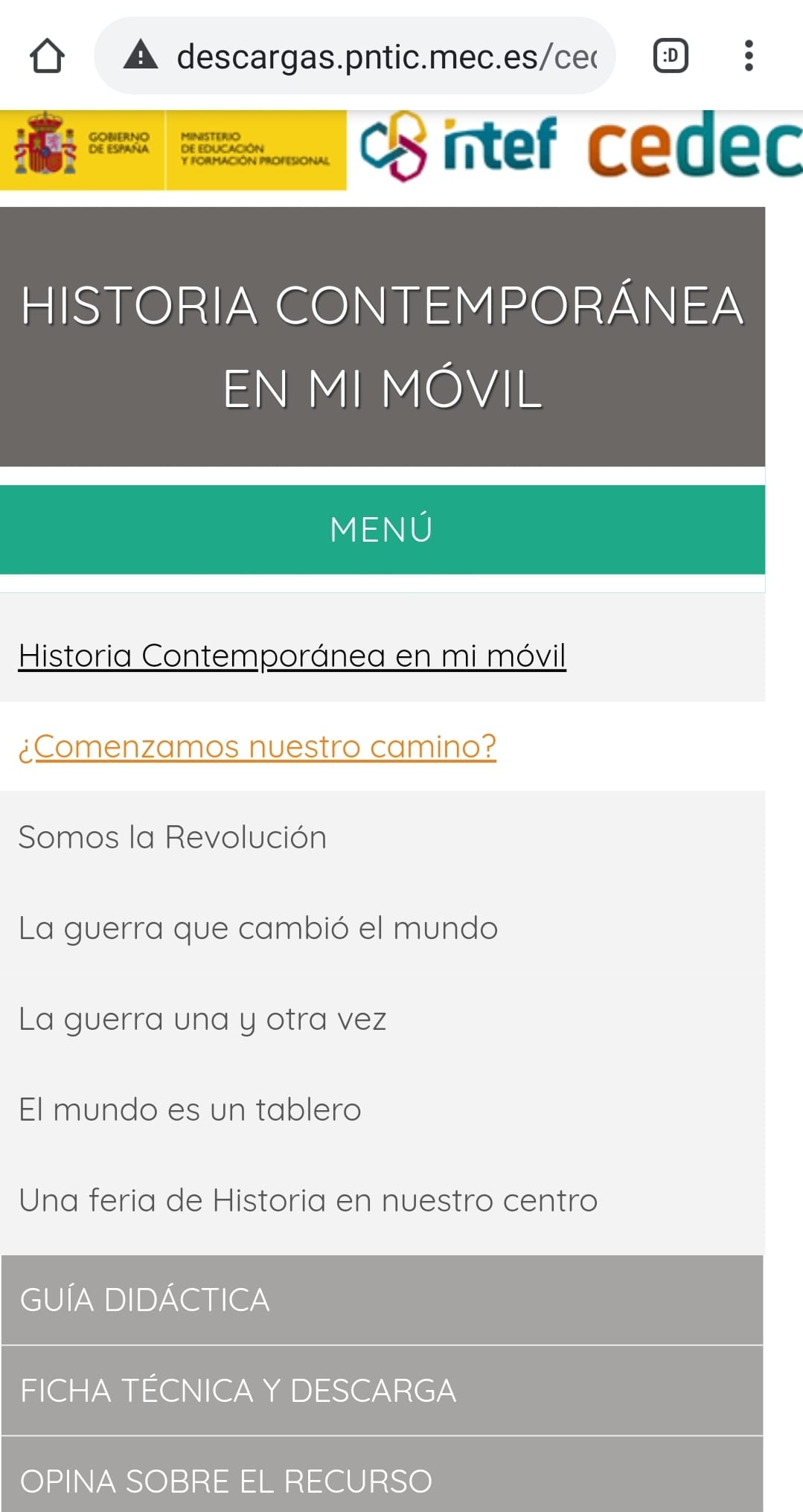 Desde el Proyecto EDIA de Cedec proponemos un Recurso Educativo Abierto diseñado específicamente para el contexto actual, Historia Contemporánea en mi móvil, que puede servir como modelo al profesorado que necesite adaptar recursos ya existentes para su utilización en dispositivos móviles.