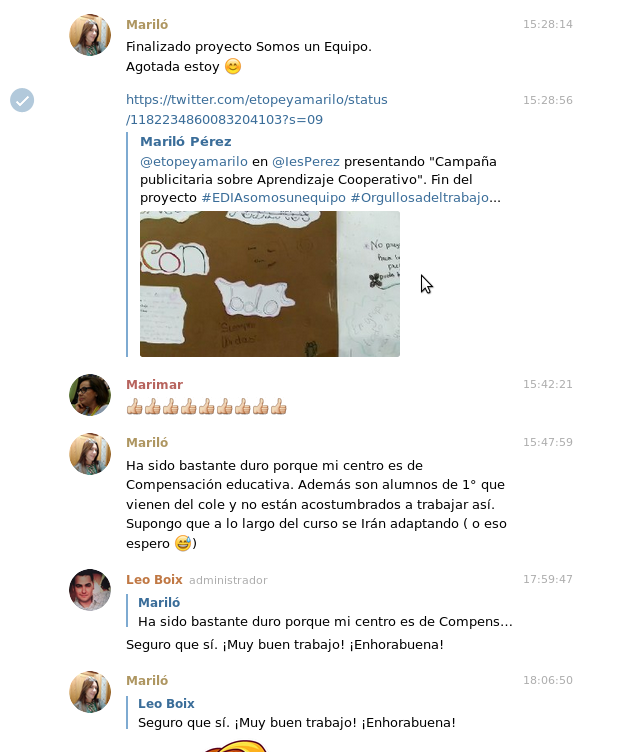 Los profesores aprenden colaborando y compartiendo ideas de manera que, a veces, la modificación de un REA y su difusión en las redes o en el grupo de Telegram ayuda a otros docentes. Otras veces, simplemente se comparten experiencias y se resuelven dudas.